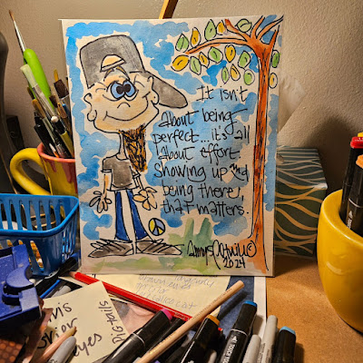 Another human I have had contact with within the past 365 days.... And no, his eyeballs are not really crossed. I tell my brain to draw normal and this is the end result of what my right hand decided upon. Also an 8 inch by 10 inch original hand drawn with a Sharpie and a mixture of colored pencils, markers, and watercolor paints on watercolor paper.  And i am the artist who performed this magic on March 21, 2024.
